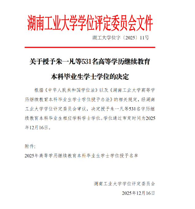 湖南工业大学2025年高等学历继续教育本科学士学位申请通知