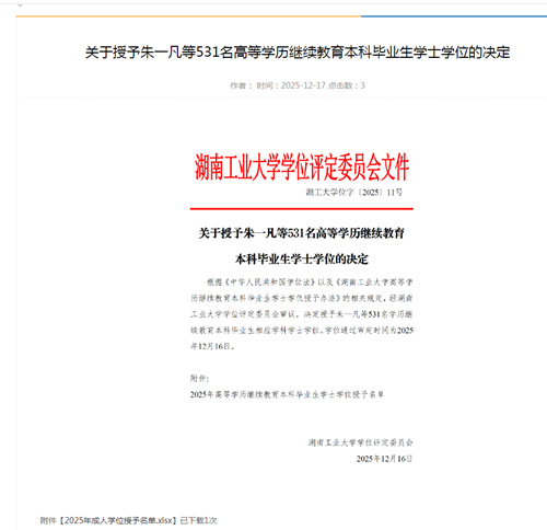 湖南工业大学2025年高等学历继续教育本科学士学位申请通知