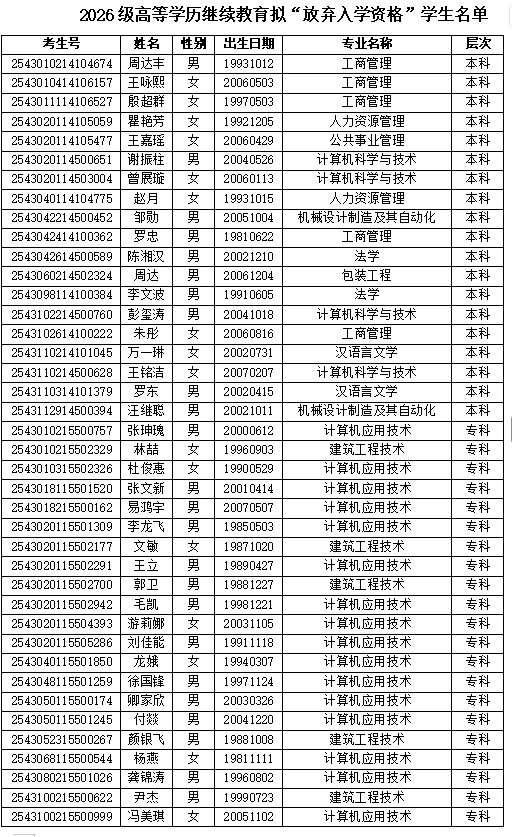 附:2026级高等学历继续教育拟“放弃入学资格”学生名单