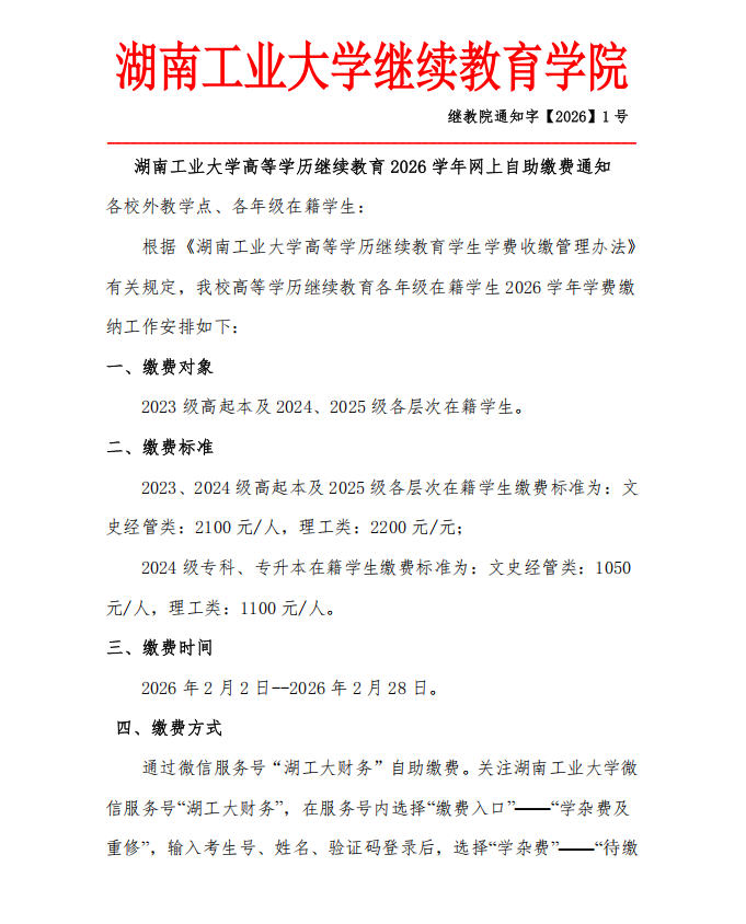湖南工业大学高等学历继续教育 2026 学年网上自助缴费通知